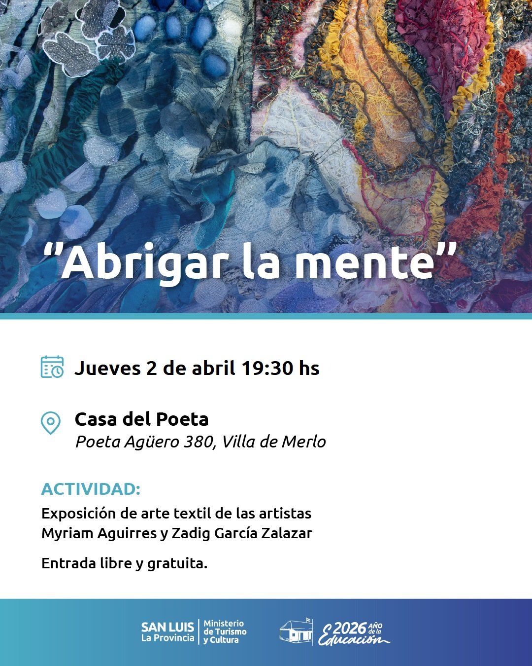 Calendario de Espectáculos del mes Notas Ciclo de espectáculos al aire libre en Amigxs de Merlo Notas Presentación del documental “Experiencias de Fe – Memorias de un pueblo con historia” Notas Exposición “Abrigar la mente” de las artistas Myriam Aguirres y Zadig García Zalazar. Notas Sixto Paz Wells presentará sus libros en la Casa del Poeta Notas Tiene fecha el 34° Encuentro de Pintores Paisajistas Edición otoño Notas Actividades culturales en Semana Santa Notas “Cartas de Amor y de Guerra”, cortometraje documental de Juan Ever Notas Convocan a autores sanluiseños para participar en la 50° Feria Internacional del Libro Notas Presentarán una escultura de tamaño natural del Cura Brochero Notas “Relatos por la memoria en el Valle de Conlara”: el documental de Identia Comunitaria ya está en las escuelas Notas Exposición: “Persistencias de la memoria” en la UNLC Notas Memoria activa en la UNLC: voces, arte y reflexión a 50 años del golpe 1 2 3 4 5 … 7 8 9 10 Next »
