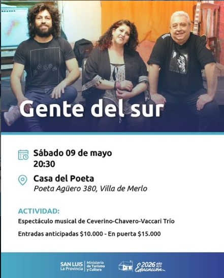 Calendario de Espectáculos del mes Notas “Relatos por la Memoria en el Valle del Conlara” ya pueden verse en youtube Notas Convocatoria de la Secretaría de Gestión Cultural e Identidad merlina Notas 39 autores de San Luis en el stand “Cuyo Cultura” de la 50° Feria del Libro de Buenos Aires Notas “Resolaneando” entre tonadas y cuecas, chayas y vidalas Notas Nueva función de tragicomedia romántica “Norma” Notas Las instituciones educativas ya pueden inscribirse para participar del 28° Encuentro de Pintorcitos Notas Exposición “Bitácora de las Formas Invisibles” Notas “Ikigai” Función especial Notas Festival por los derechos de lxs artistas Notas Nuevos talleres de Escritura Creativa con Luciana Makinistian Notas Kevin Johansen y Liniers en la Villa de Merlo Notas Jornadas de capacitación y reflexión: “Más juegos, menos pantallas”. 1 2 3 4 5 … 7 8 9 10 Next »