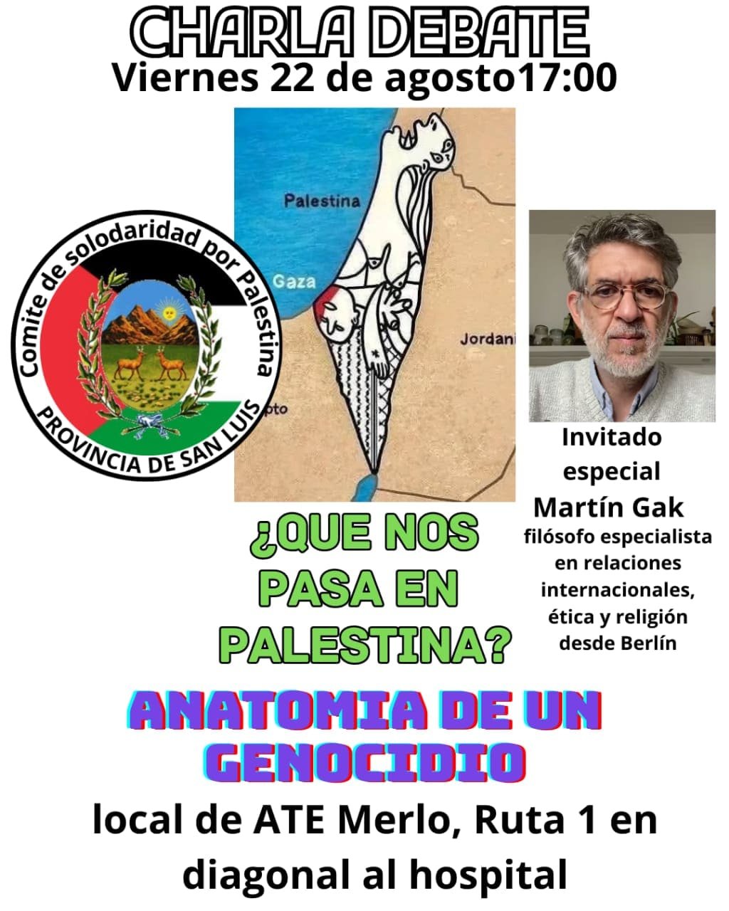 Desde la Villa de Merlo, el Comité de solidaridad con Palestina de la provincia de San Luis organiza una charla debate con el filósofo Martín Gak , especialista en ética y religión , argentino que vive en Berlín, desde donde cubre noticias internacionales para distintos medios. Gak vive hace 33 años afuera de Argentina, estudió en Estados Unidos y Francia y hace diez años se dedica a la política internacional, en especial a las zonas de conflicto.