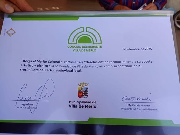 En su sesión ordinaria del jueves 27, el Concejo Deliberante Villa de Merlo le otorgo al corto “Desolación” del cineasta Juan Ortiz , el Mérito Cultural por su aporte artístico y técnico a la comunidad de la Villa de Merlo.