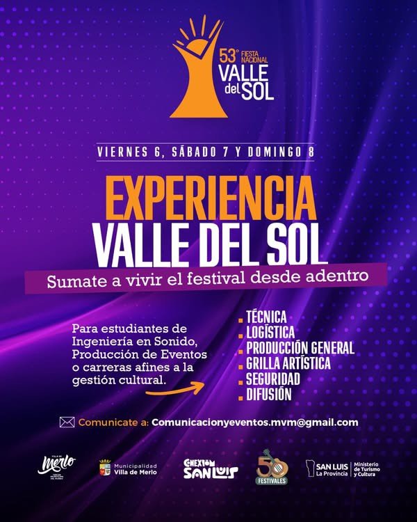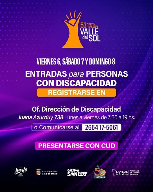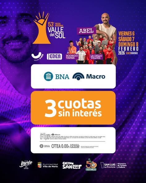Calendario de Espectáculos del mes Notas Entradas para el Festival en 3 cuotas sin interés Notas “Costumbres Merlinas” en Casa Palmira Notas El Municipio de la Villa de Merlo invita a vivir la Experiencia Valle del Sol Notas Feria de Libros y Arte: “La Cantata de los Libros” Notas Merlo DesaKTdo en la previa al Festival Valle del Sol Notas “Los Tres Chanchitos” en la cuarta fecha del Ciclo “Conciertos Acordes” Notas Cómo gestionar las entradas para el Festival para las personas con discapacidad Notas Último día de preventa de entradas para el Festival Notas Alrededor de 5.000 personas participaron en la 29° Fiesta del Mate Puntano Notas Doble Fiesta del Mate Notas “De un Entrevero”: Omar Cyrulnik-Gabriela Reides en concierto Notas Agenda cultural de verano « Previous 1 2 3 4 5 6 7 8 9 10 Next »