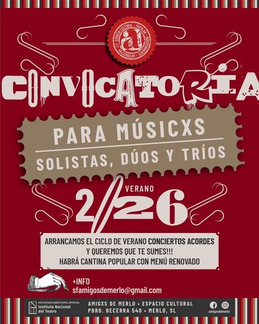 Calendario de Espectáculos del mes Notas Movilizar para defender la cultura Notas Apertura de la Temporada Turística 2026 Notas Peña en “La Vieja Estación” Notas Inscripciones 2026: la UNLC invita a sumarse a su propuesta académica Notas Estreno del Cortometraje documental “Merlo Bajo Cero” Notas “De la tierra somos” exposición de Claudia Rolando en Casa Palmira Notas ¿Por qué odian el Arte? Notas Vuelve el “Recorrido de las Artes” en espacios de toda la provincia Notas Amigxs de Merlo convoca a músicos Notas Una costumbre generosa: como cada fin de año, el escultor Luis Saez regala una de sus piezas en metal golpeado Notas Concierto de Despedida de Año en La Cometa Notas Presentación del libro “El Murmuro de las Plantas” en el campus de la FTU « Previous 1 2 3 4 5 6 7 8 9 10 Next »