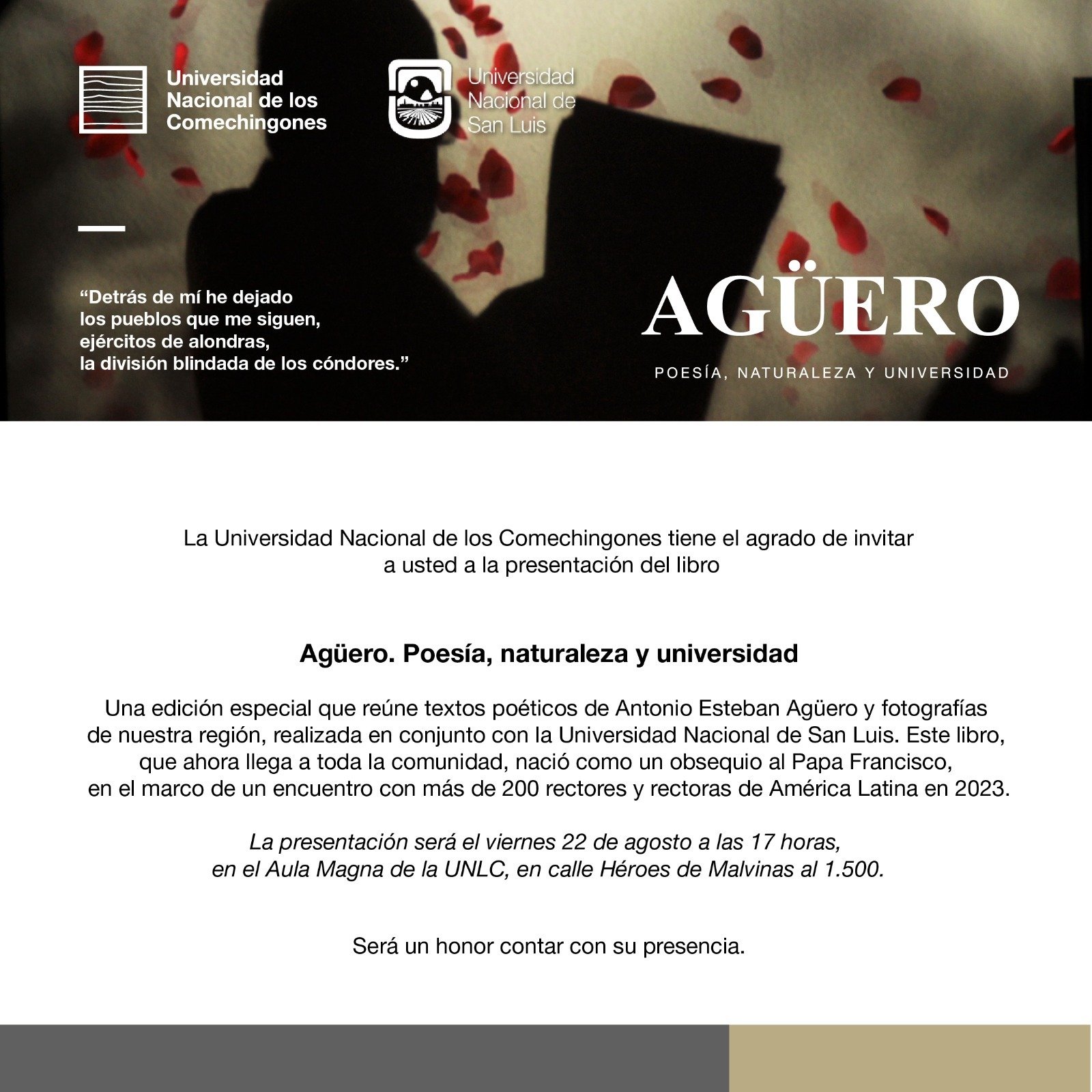La Universidad Nacional de los Comechingones invita a la comunidad a participar de la presentación del libro “Agüero. Poesía, naturaleza y universidad” que reúne textos poéticos de Antonio Esteban Agüero y fotografías de nuestra región. Se trata de una edición conjunta de las editoriales de la UNLC y la UNSL.