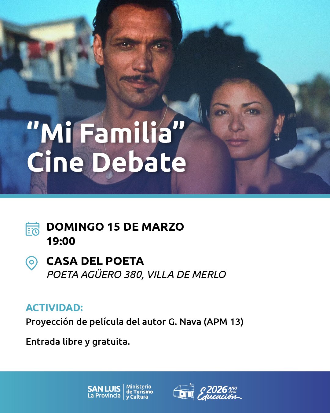 Event date: 15/03/2026 El domingo 15 de marzo a las 19:00 en el ciclo de Cine Debate se proyectará “Mi familia”, de G. Nava (México/ Estados Unidos, 1995). La entrada es gratuita. Organiza: Asociación Civil “La Ventana”.