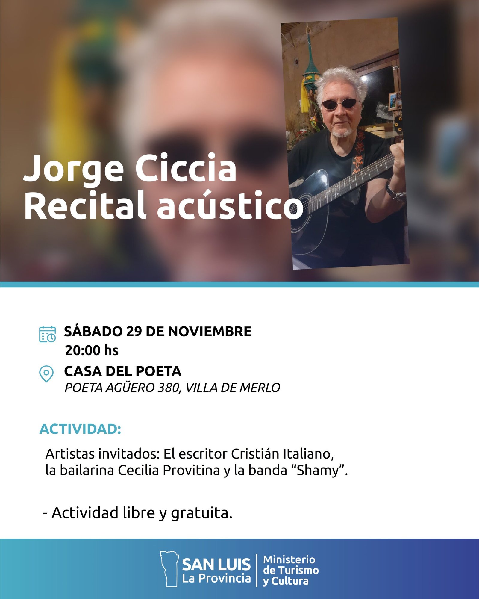 Event date: 29/11/2025 El sábado 29 de noviembre a las 20:00 hs se presenta en la Casa del Poeta el artista Jorge Ciccia con su espectáculo de literatura y música.  Artistas invitados: El escritor Cristián Italiano, la bailarina Cecilia Provitina y la banda “Shamy”.  Entrada $7.000