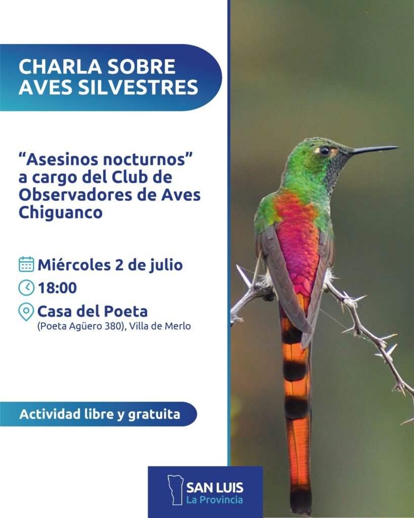 Sábado 28 – 18:00 hs: Charla COA El sábado 28 de junio a las 18:00 hs el Club de Observadores de Aves Chiguanco (COA) brindará una charla sobre aves silvestres, acompañada de proyecciones de diversas especies de la zona titulada “¿Dinosaurios vivos?” El COA Chiguanco de la Villa de Merlo, perteneciente a Aves Argentinas, ha