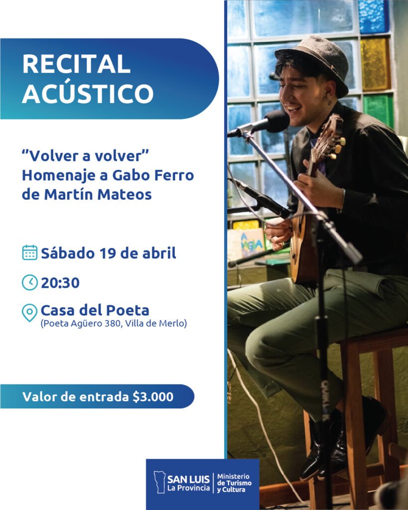 El sábado 19 de abril a las 20:30 hs el artista Martín Mateos presenta su espectáculo “Volver a volver – Homenaje a Gabo Ferro” en el auditorio de la Casa del Poeta. Será un recital en formato acústico en homenaje al reconocido poeta, músico e historiador Gabo Ferro. Entrada $3000 (menores de 10 años no